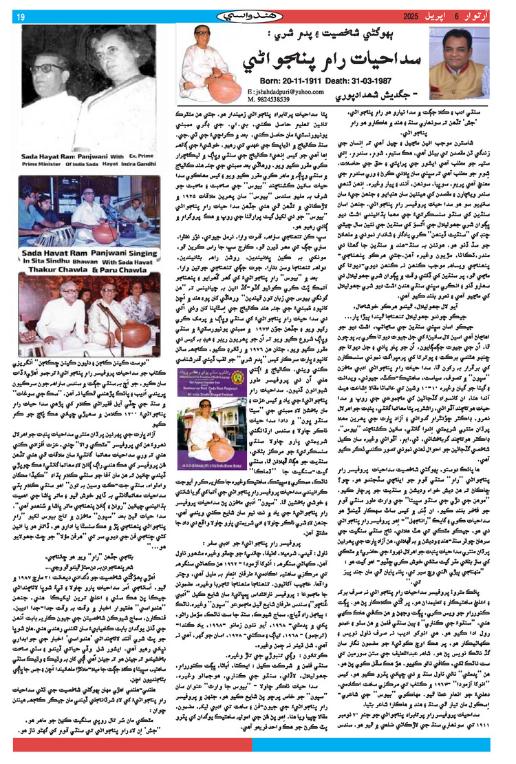Hindvasi Newspaper is not only the medium of entertainment and education but has also, time after time, during calamities, supported in bringing together the disturbed generation. That calamity can be an attack by Pakistan or natural disasters. Hindvasi Newspaper has unveiled the informative side of every news. After strong and experienced editors like Hiranand Karamchand and Teerath Sabhani, Shobha Lalchandani is now sincerely shouldering the responsibility with full dedication. Every year on the occasion of Sindhi New Year Cheti Chand, there is cover and back page printed in color, the sponsors advertise, and 6 to 8 editions are printed on glossy paper.